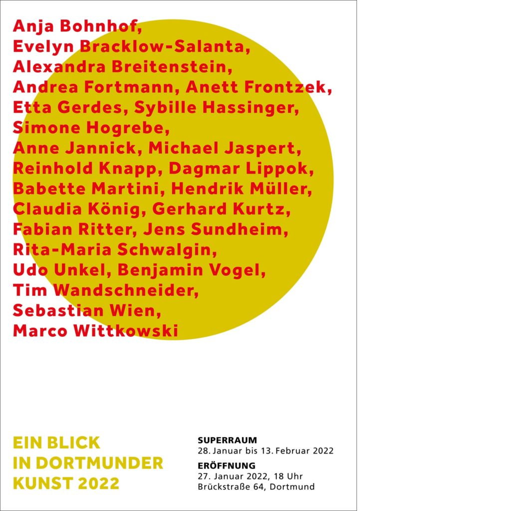 Städtischer Kunstankauf 20th January 2022 Exhibition of recently acquired works by the city of DortmundSadly, the opening is cancelled due to Covid-19 restrictionsSUPERRAUM, Dortmund28 January – 13 February 2022open Tue 12–16h, Wed 14–18h, Thu 16–19Finissage Sun 13 Feb 14–18